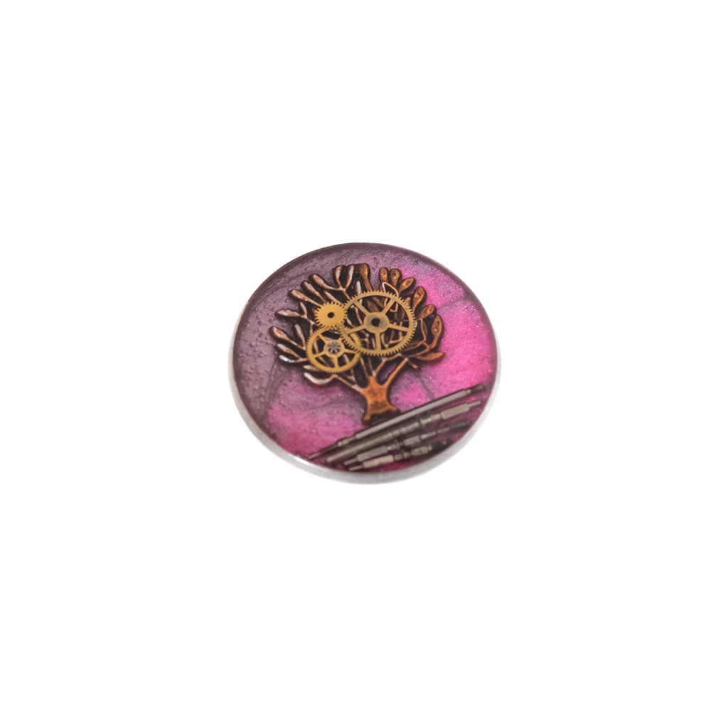 A pink painted base intensifies the contrast behind the Tree of Life form and exposed watch gears sealed in resin. This upcycled watch parts jewelry piece balances organic symbolism with mechanical structure, creating a compact yet visually assertive brooch. Built on stainless steel for durability in a 25mm format.