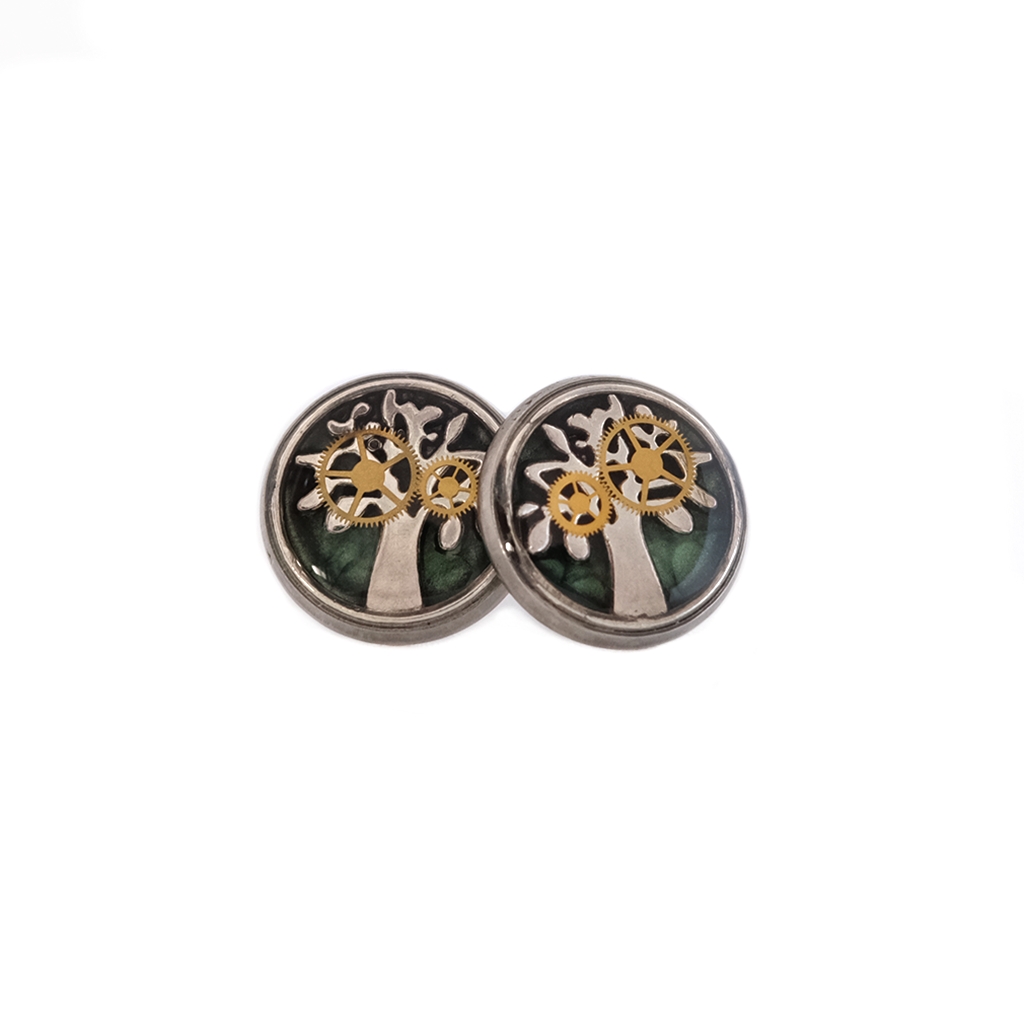 A green painted base frames a Tree of Life symbol layered with exposed watch gears and sealed in resin. These Tree of Life stud earrings reinterpret a symbolic motif through mechanical structure, creating a compact steampunk-inspired accessory.