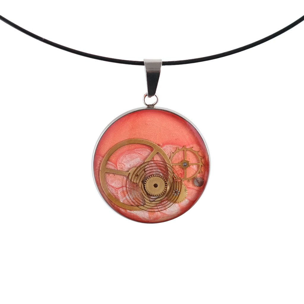 A saturated orange painted base establishes warmth beneath exposed circular watch components. Interlocking brass forms generate layered mechanical depth without a separate charm element. Resin sealing stabilizes the arrangement, resulting in a structured industrial pendant built entirely around recycled watch parts.