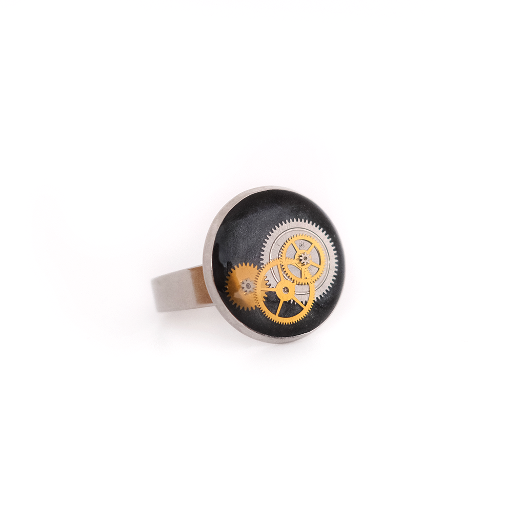 A dark black base intensifies the metallic tones of interlocking gears arranged in a tight circular layout. The resin layer locks the structure in place, while the adjustable stainless steel band allows the diameter to expand or reduce for a secure mechanical statement ring.